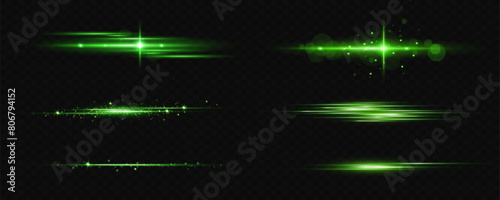 Vector illustration in green color. Set of lighting effects. Glare and flashes. Bright rays of light. Glowing lines. Vector illustration. Dust.Neon