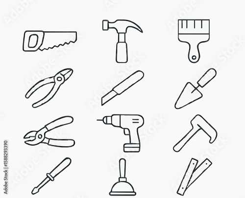 Vector illustration of 12 unique minimalist handheld construction tools line art icons in a 3×4 grid for contractor branding, DIY apps, hardware store graphics, construction training materials, and wo