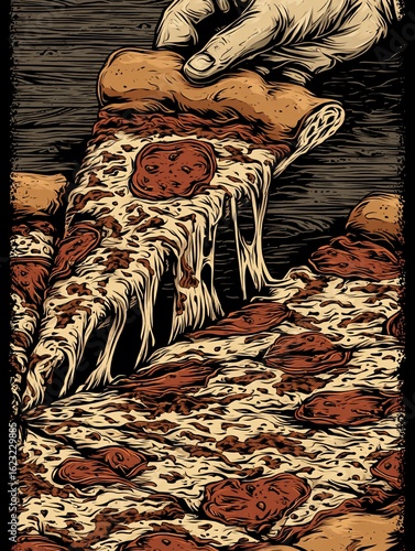 vector illustration of a hand pulling a cheesy pizza slice with long cheese strings stretching from the main pie hand pulling pizza slice melted cheese strings close up vector cheesy detail