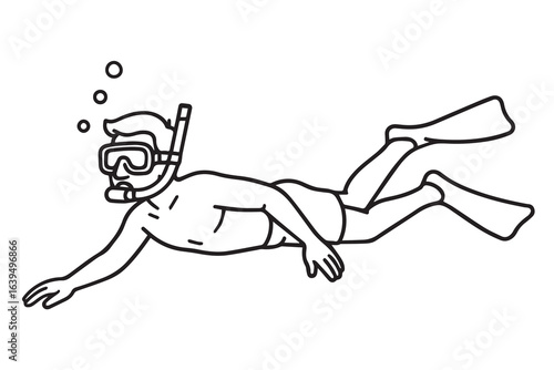 Vector illustration of a man snorkeling underwater in the sea, created in black and white style with bold and clearly defined black outlines.