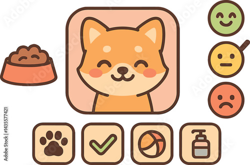 Vector illustration of a virtual pet care app with food bowl, mood meter, pet avatar, and daily tasks. Cute and interactive style, no text, transparent background