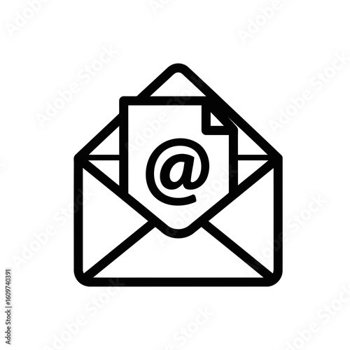 Vector illustration of an open envelope with a document inside displaying the at symbol, representing email communication