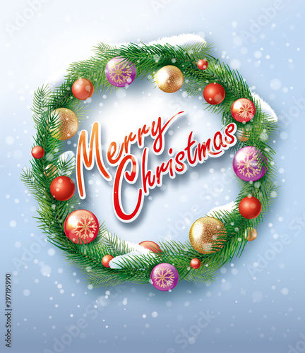 Vector illustration of christmas wreath. Green fir branches, glance and bright multi-colored christmas toys. Snow on the branches. Snowflakes background and "Merry Christmas" lettering