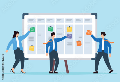 Vector illustration of colleagues using sticky notes to outline project phases on whiteboard