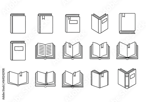 Vector illustration of collection of book icons in various open and closed positions, isolated on white background