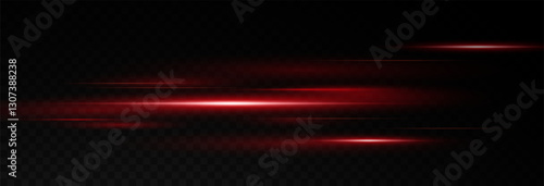 Vector illustration of red color, abstract laser speed lines. Glare, horizontal light rays png. Glowing linear background.
