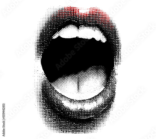 Vector illustration of retro halftone scream collage, open mouth in dotted pop art style, vintage punk elements, grunge mixed media art, abstract poster design, crazy artwork.