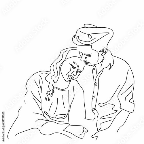 Vector illustration of the lineart hugging a reclining couple. One line drawing style. romantic couple