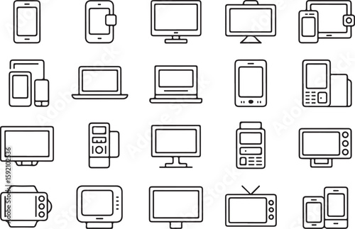 Vector illustration of various electronic devices and gadgets in modern black and white outline