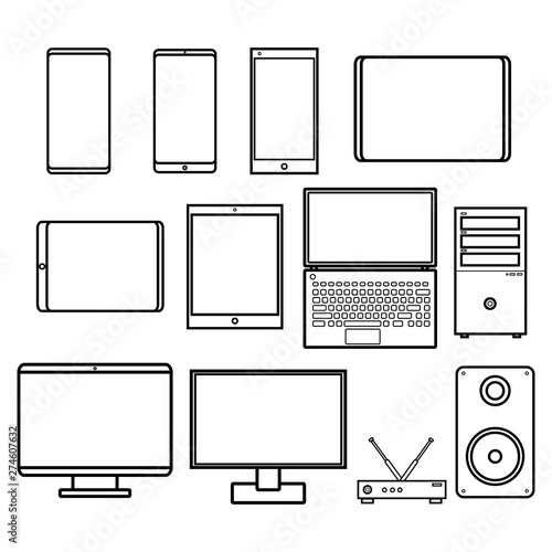 Vector illustration set of black and white flat icon of simple modern digital smartphones computers monitors modems on a white background. Concept: computer digital technologies