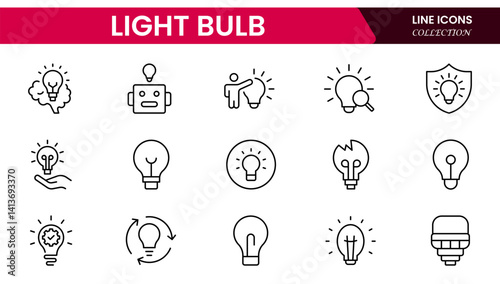 Vector illustration web line icon collection showcasing light bulb designs representing ideas, innovation, creativity, energy, solutions, thinking, inspiration, technology, brightness, and invention.