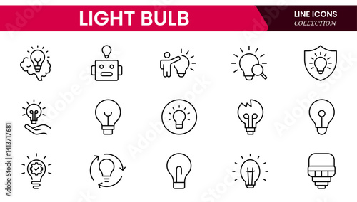 Vector illustration web line icon collection showcasing light bulb designs representing ideas, innovation, creativity, energy, solutions, thinking, inspiration, technology, brightness, and invention.