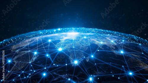 Vector illustrations of blue futuristic world map or globe with circuit line connecting the dot.Digital communication innovation and technology concepts.