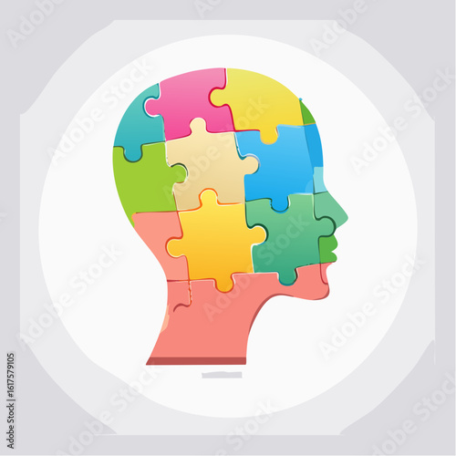 Vector infographic of human head made up of puzzle pieces, symbolizing mental health, thinking, and complexity of the mind