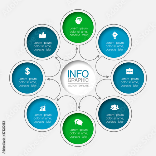 Vector infographic template, circle with 8 steps or options. Data presentation, business concept design for web, brochure, diagram.