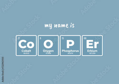 Vector inscription name COOPER composed of individual elements of the periodic table. Text: My name is. Purple background