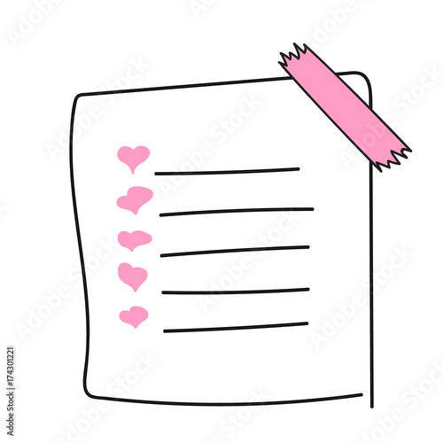 Vector isolated outline hand drawn check to do list, bullet, check mark and check box in a doodle sketch cartoon style. Paper note with task plan with heart and tape