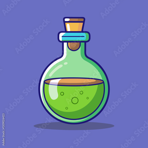 Vector Laboratory Flask with Green Liquid and Bubbles, Vector illustration of a laboratory flask filled with green liquid and bubbles, topped with a cork stopper, set against a purple background.