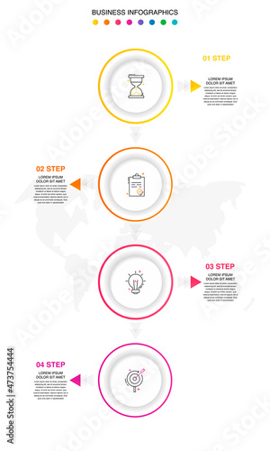 Vector line infographics template for four arrows and circles. Business concept with 4 elements and icons. Modern blank space for chart, content, step for step, timeline, diagram, web