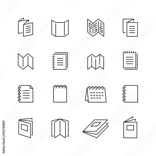 Vector line set of icons related with brochure. Contains monochrome icons like booklet, book, polygraphy, brochure, paper and more. Simple outline sign.