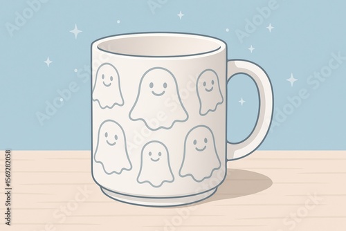 Vector mockup of a ceramic mug with smiling Halloween ghost icons