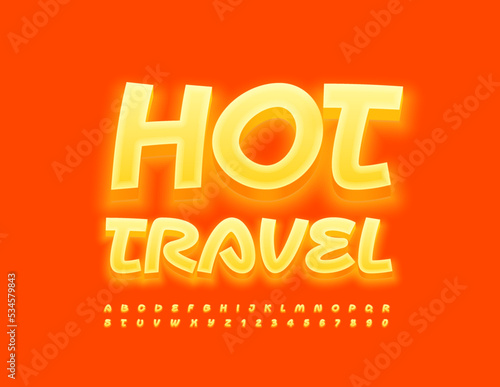 Vector modern emblem Hot Travel. Glowing Orange Font. Creative Alphabet Letters and Numbers set
