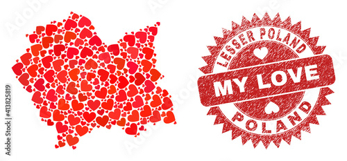 Vector mosaic Lesser Poland Voivodeship map of love heart elements and grunge My Love seal stamp. Mosaic geographic Lesser Poland Voivodeship map constructed with love hearts.