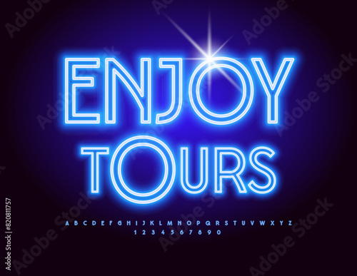 Vector Neon advertisement Enjoy Tours. Blue Glowing Font. Bright Neon Alphabet Letters and Numbers set.