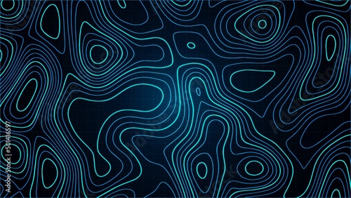 Vector neon background. Map design. Ornament glow chaotic circles on water, lines, waves. Geolocation. Scale grid. Itinerary. Rock garden. Smoke rings. Poster travel, business, social networks.