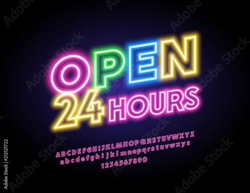 Vector neon colorful amblem Open 24 Hours. Glowing Font for Business Banner. Alphabet Letters, Numbers and Symbols