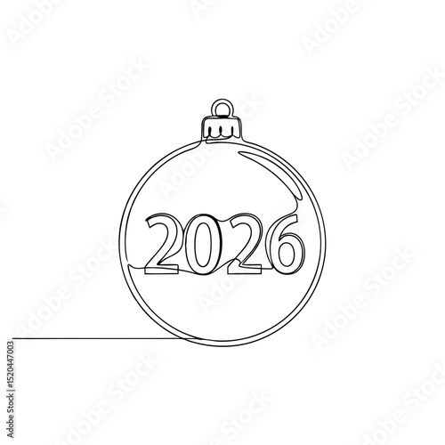 Vector one-line illustration of a Christmas ornament with the number 2026 in continuous line style for Christmas and New Year decoration. Icon of Christmas ball decor in PNG and SVG formats
