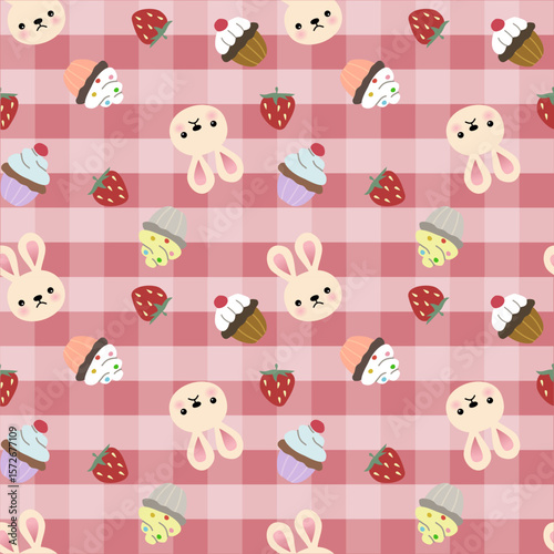 Vector pattern of fabric, wallpaper, gift wrap, mat and bed sheet. Continuous and repeatable. Designed with plaid, strawberry and rabbit alternating in cute style.
