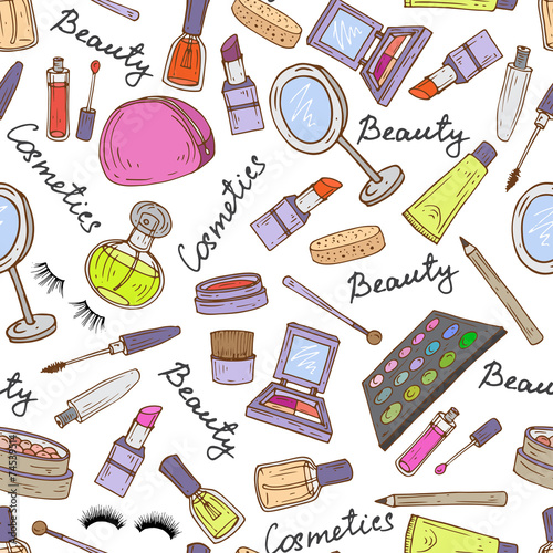 Vector pattern with hand drawn attributes of cosmetics