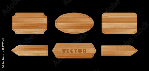 Vector realistic natural brown wooden plaque set. Wood texture rectangle, round, arrow signboard isolated on black background. 3d empty wooden frame for game sign, timber banner, vintage message, menu