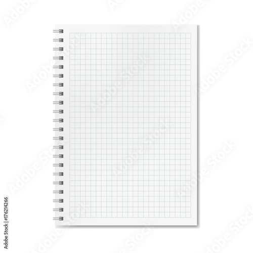 Vector realistic quadrille or graph ruled notebook. Copybook with blank quad paper on metallic ring spiral, organizer mockup or template for your text
