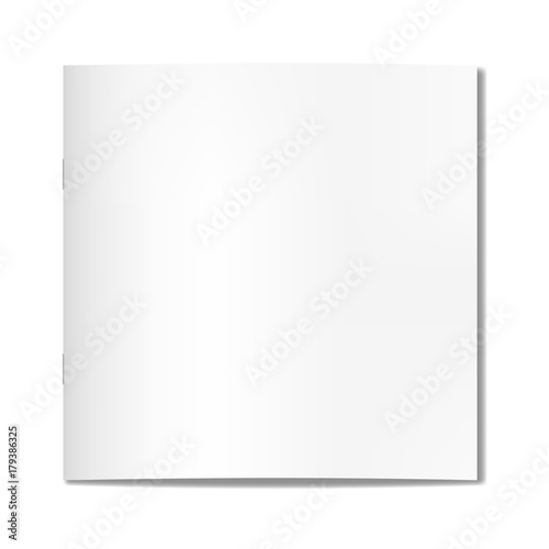 Vector realistic square closed book, journal or magazine on staples mockup. Blank front or cover page of sketchbook or notebook template for catalog, brochure design