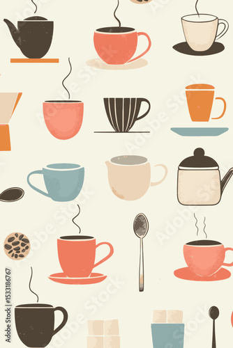 Vector seamless background of cozy coffee cups and beans in pastel tones for morning-themed projects.