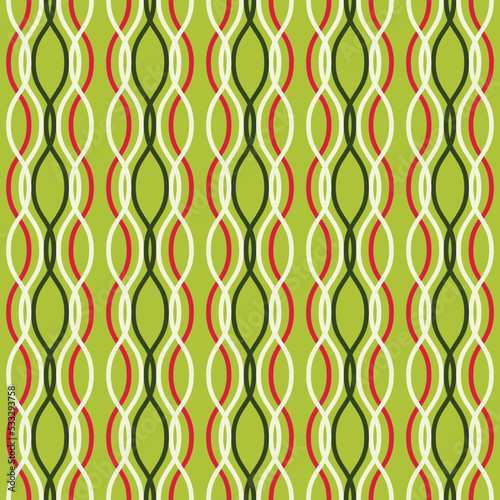 Vector seamless pattern. Colored vertical wavy lines intertwined on a light green background. Illustration great for holiday background, Christmas, greeting card design, textiles, packaging, wallpaper