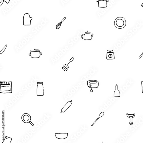 Vector seamless pattern of hand drawn kitchen stuff. .