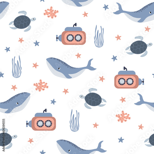 Vector seamless pattern with whale, submarine, turtle, starfish, algae.Underwater cartoon creatures.Marine background.Cute ocean pattern for fabric, childrens clothing,textiles,wrapping paper