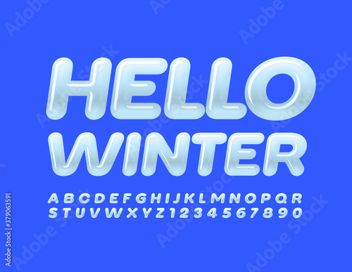 Vector season banner Hello Winter. White glossy Font. Modern Alphabet Letters and Numbers set