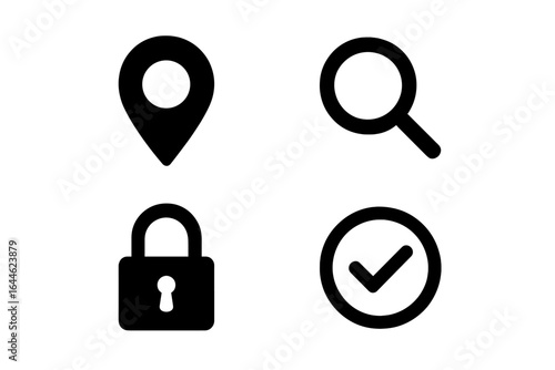 Vector Set for Web and Apps with Location Pin, Search Magnifier, Security Lock, and Approval Checkmark Icons on Transparent Background, Perfect for UI Design and Digital Projects