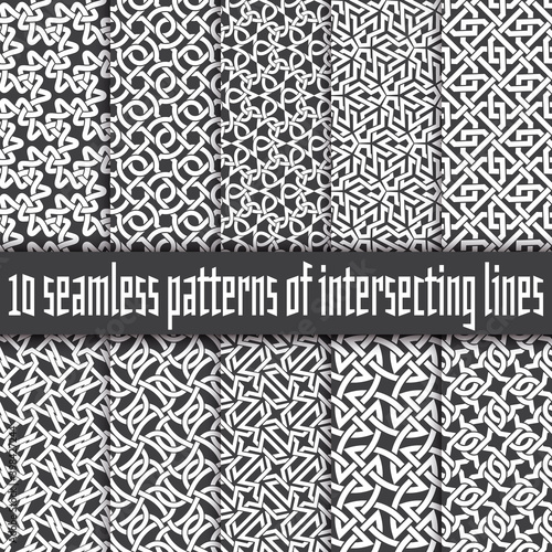Vector set of abstract seamless patterns. Ten swatches of white lines on black backgrounds.