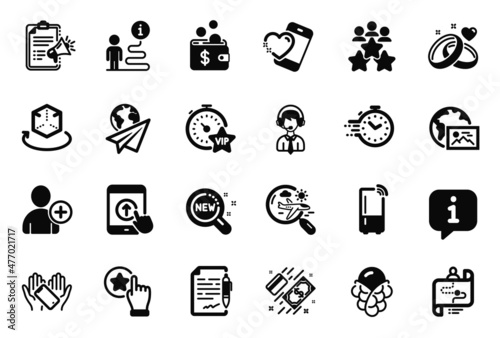 Vector Set of Business icons related to Payment, Swipe up and New products icons. Refrigerator, Add user and Web photo signs. Marriage rings, Paper plane and Agreement document. Vip timer. Vector