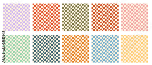 Vector set of checkered retro seamless patterns.Retro groovy checkered distorted patterns.Retro wavy psychedelic checkerboard
