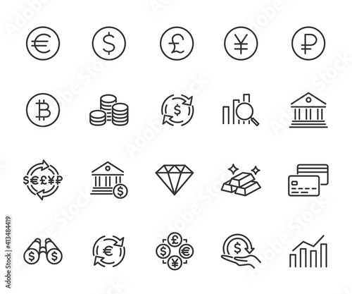 Vector set of currency line icons. Contains icons investment, exchange rate, bank deposit, coin, financial forecast, bank and more. Pixel perfect.