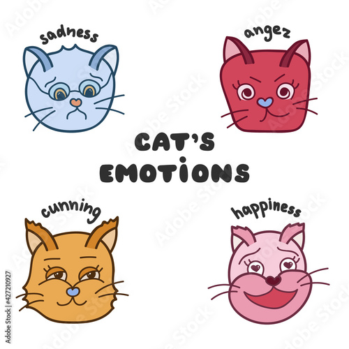 Vector set of cute cat’s faces close up with different emotions (happiness, anger, cunning, sadness). Trendy colorful cliparts with lettering and hand drawn vector outline. Isolated on background.