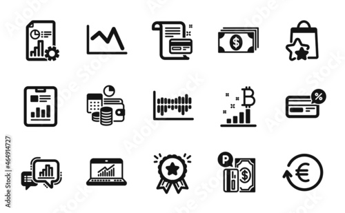 Vector set of Parking payment, Report document and Banking icons simple set. Online statistics, Line chart and Payment card icons. Bitcoin graph, Loyalty points and Cashback signs. Vector