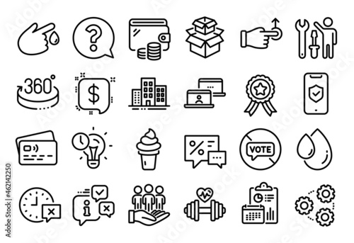 Vector set of Phone protection, Gears and Buildings line icons set. Calendar report, Money wallet and Credit card tag. Dumbbell, Blood donation and Payment message icons. Vector