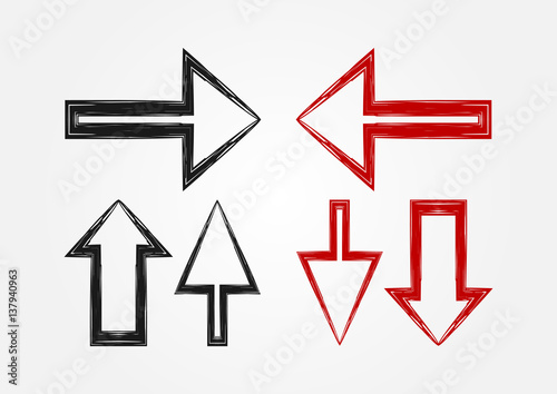 Vector set of pointers. Three isolated arrow icons. Black and red version.